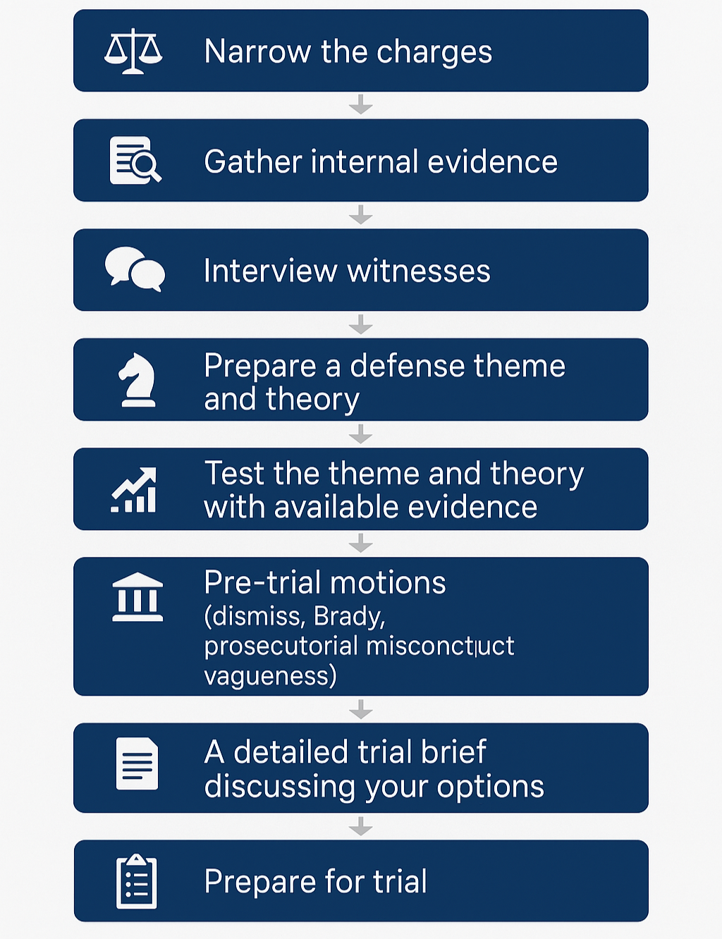 Indictment: Formal charges are filed if probable cause is found. Counsel reviews charges to develop defense strategies.