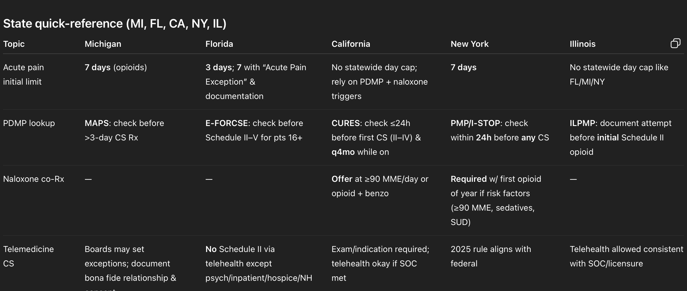 For prescribers navigating DEA, telemedicine, CMS/Medicare, private payers, and key state rules (MI, FL, CA, NY, IL).